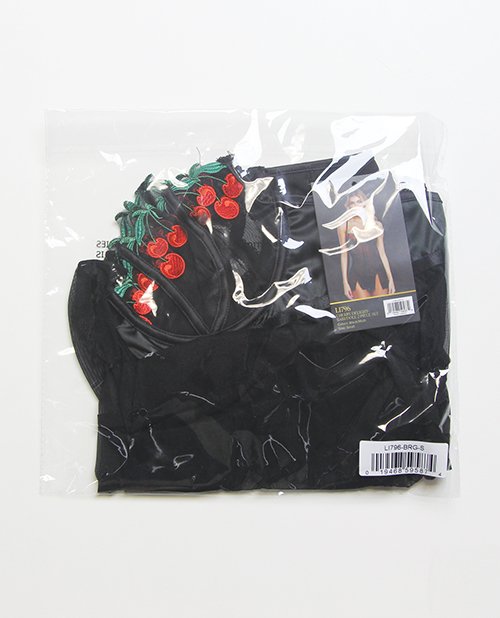 Cherry Delight Babydoll 2pc Set. Babydoll:Embroidered cherry lace and mesh, Balconette cup with underwire, Split front skirt. Thong:Mesh, Cotton gusset, Single string thong back. XL: Cup- D-DD. Bust - 40-42 inches. Waist - 31-33 inches. Hips - 41-43 inches.