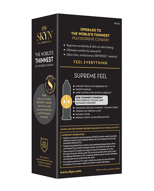 Upgrade to the new era of SKYN condoms with SKYN SUPREME FEEL and experience the ultimate comfort and natural fit. Made from our revolutionary SKYNFEEL material, these premium, polyisoprene lubricated condoms are our thinnest ever, and provide supreme sensitivity and skin-on-skin feeling with a long-lasting, ultra-smooth lubricant. They are non-latex, making them a great choice for anyone with latex allergies or sensitivities, and dont have a rubber latex smell. SKYNs SUPREME FEEL non-latex condoms are as strong as premium latex, tested to the highest safety standards of safety and reliability and are safe to use with water-based lube and silicone lube. SKYN FEEL EVERYTHING.