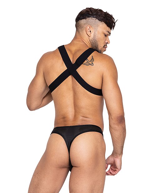 Master Harness. Harness: Chest Yoke Hook & ring closure Perforated spandex. Large: Chest 46-48 inches. Hips 46-48 inches. Neck 17-17.5 inches. Sleeve-35-36 inches.